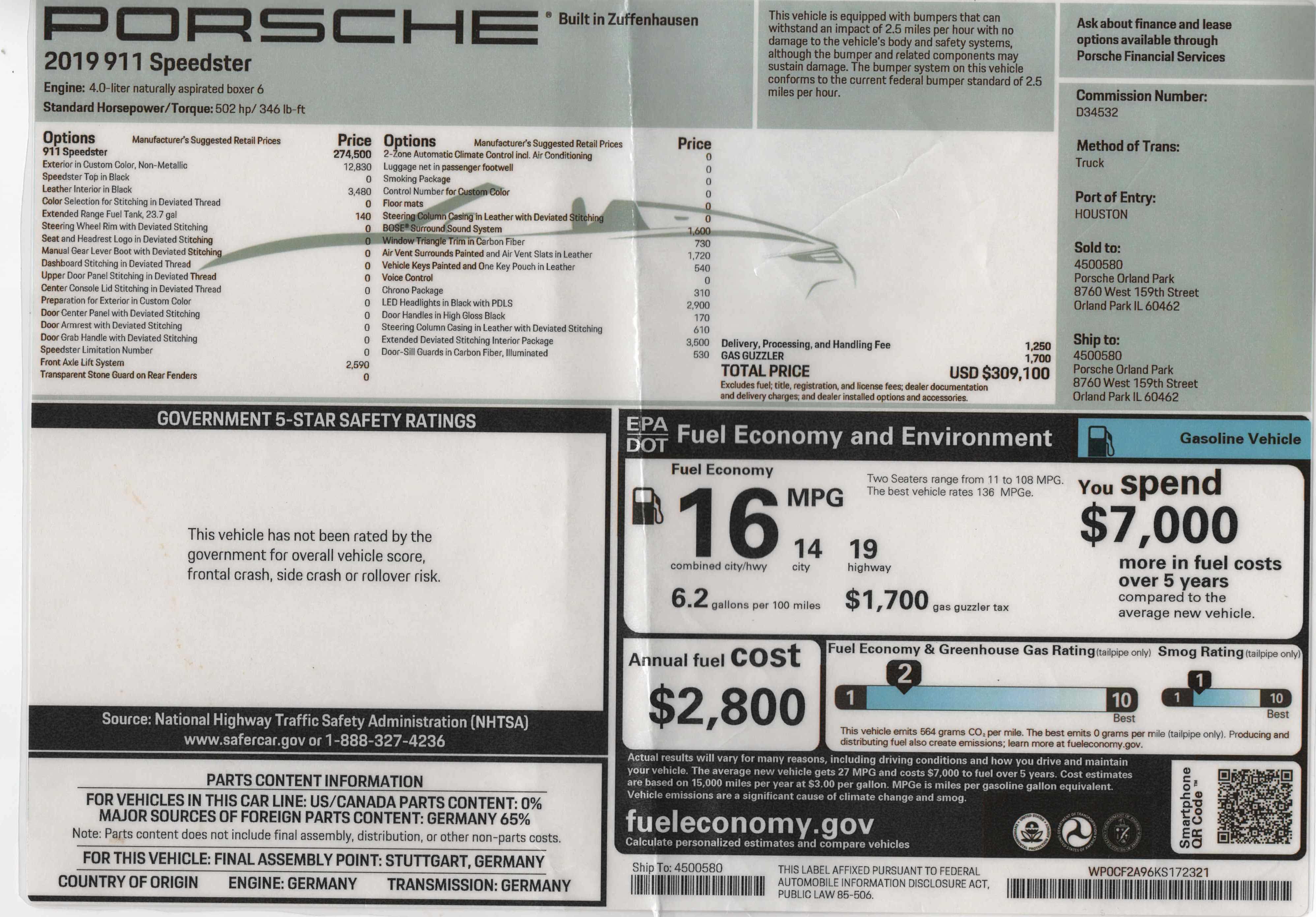 This 2019 Porsche 911 Speedster stands out not only for its limited worldwide production but also for its extraordinarily rare Paint‑to‑Sample specification. With just 1,821 miles, complete Porsche dealer service history, and a meticulous option list totaling over $309,000, this Speedster represents a blue‑chip collectible for the discerning Porsche enthusiast.